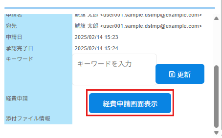 経費申請にて作成した文書を長期保存した場合、[経費申請画面表示]をクリックすると経費申請書詳細を確認できます。