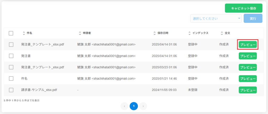 2.長期保存したい文書にチェックを入れ[キャビネット保存]をクリックします。