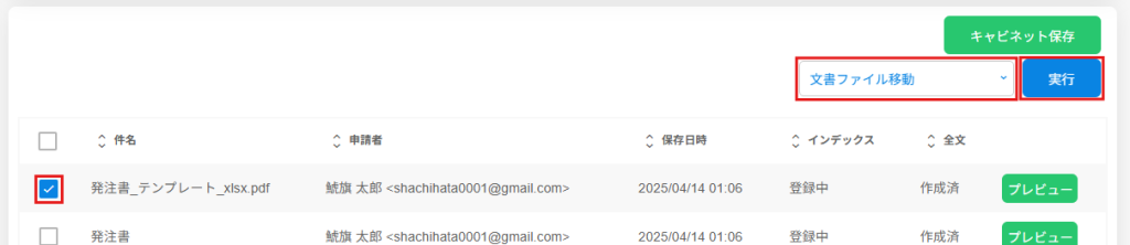 1..移動したい文書にチェックを入れ、プルダウンより[文書ファイル移動]を選択し[実行]をクリックします。