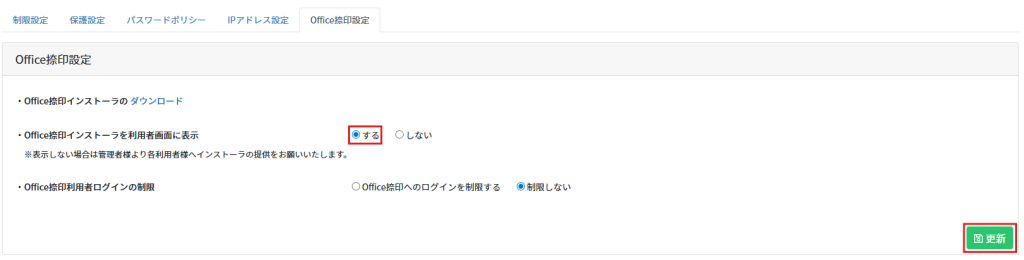 2.[Office捺印]タブを開き、「Office捺印インストーラを利用者画面に表示」を「する」に設定し、[更新]をクリックします。