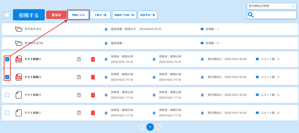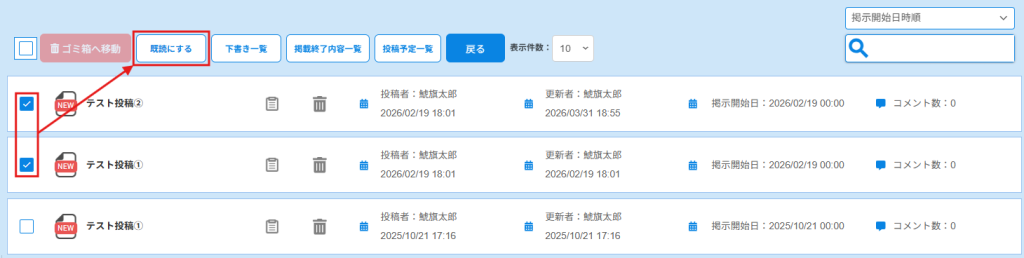 掲示板のトピックを複数選択し、一括で既読にすることができます。