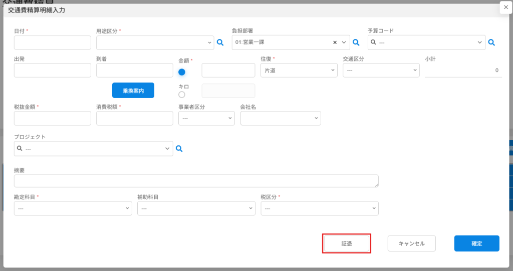 1.申請を行いたい項目のヘッダー部を表示、または明細入力画面の[証憑]をクリックします。