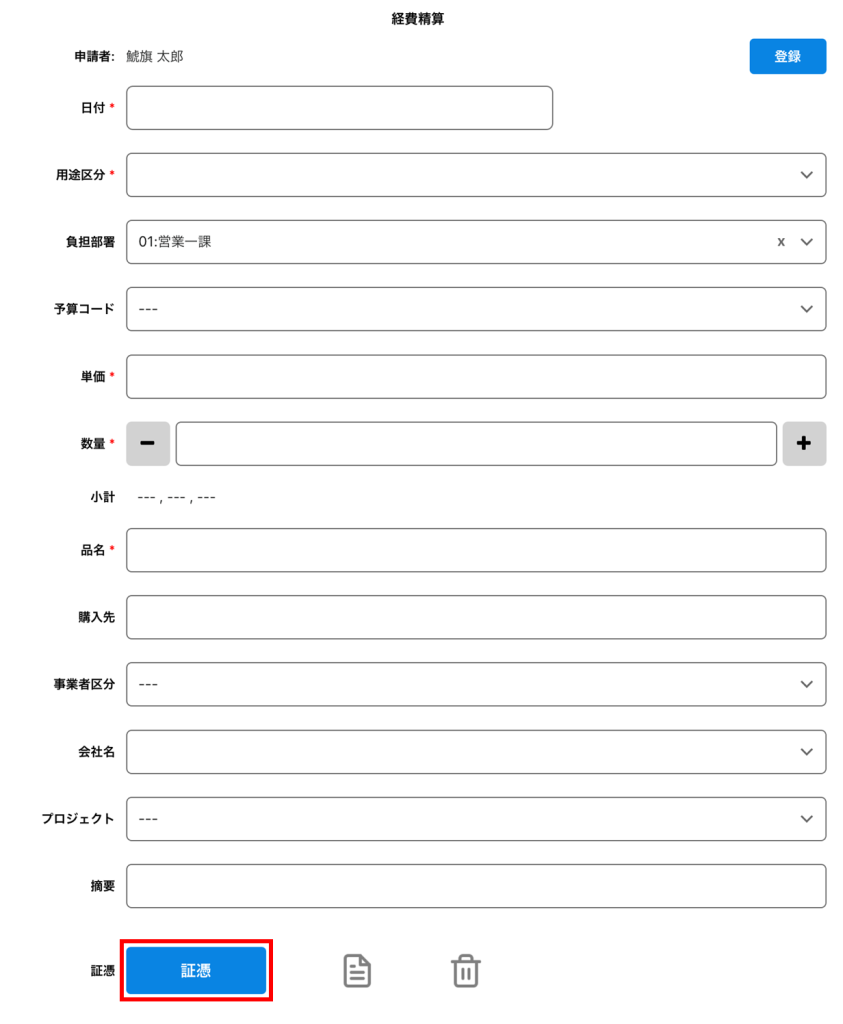 1.ヘッダー情報登録画面の[添付]または明細登録画面の[証憑]をクリックします。