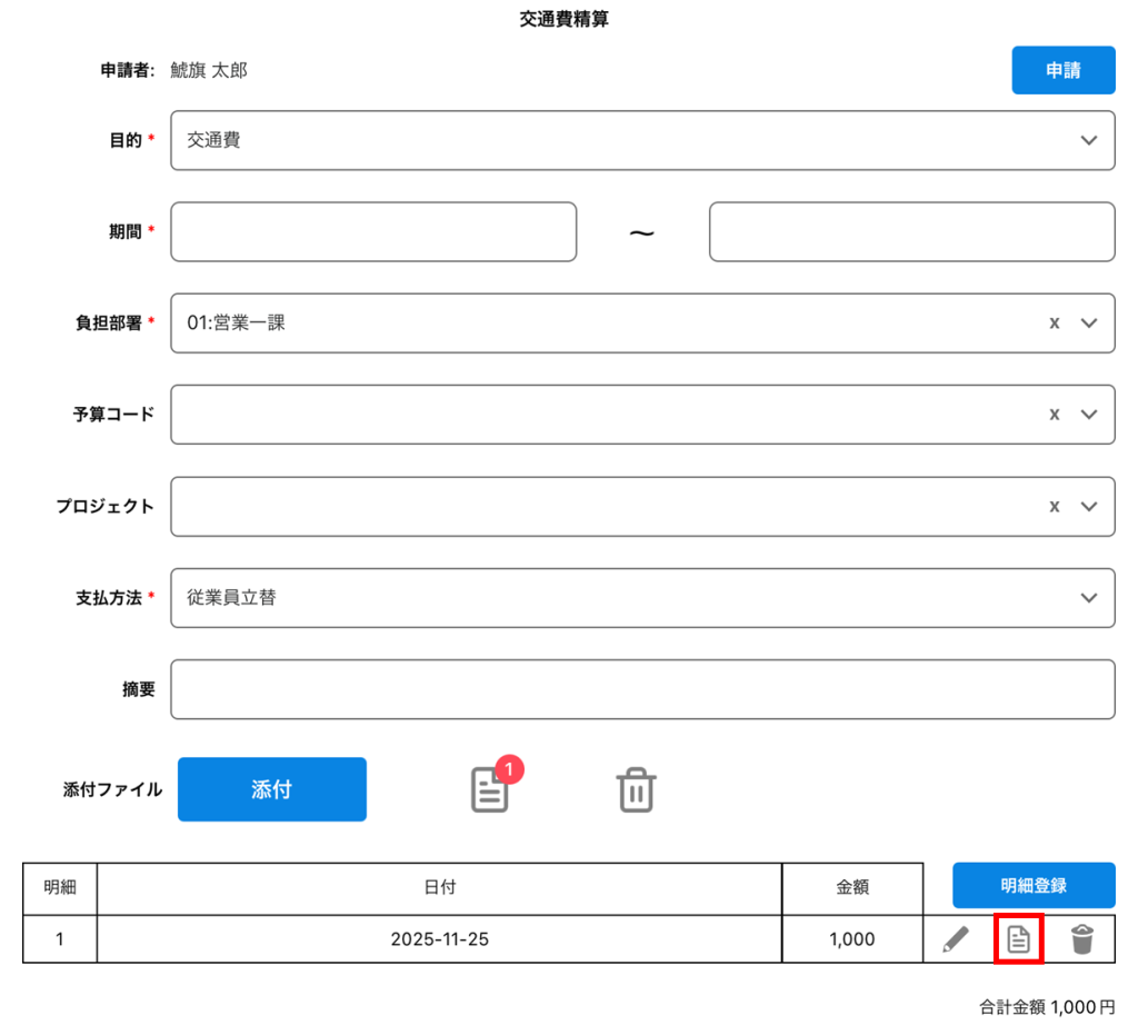4.明細にファイルをアップロードすると、明細行の証憑欄にプレビューアイコンが表示されます。
