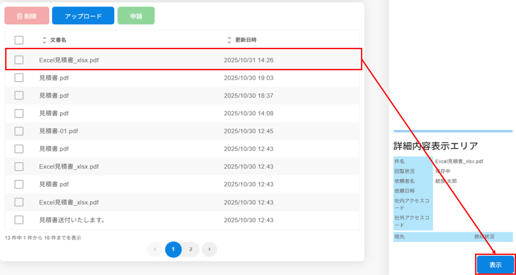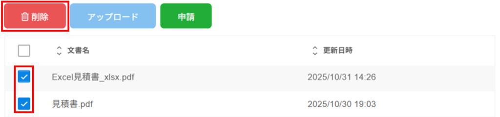 2.削除したい文書にチェックを入れ、[削除]をクリックします。