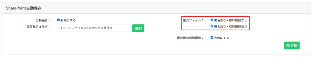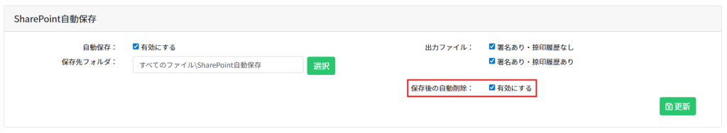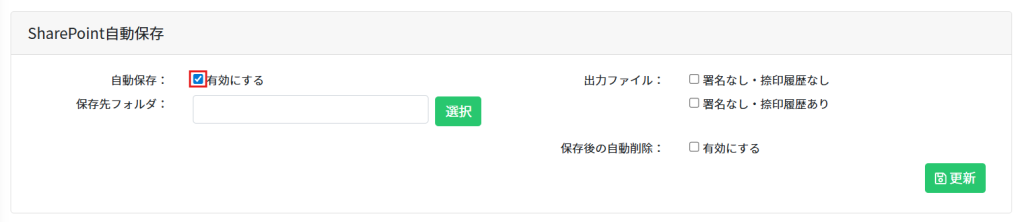 管理者が「SharePoint自動保存」機能を有効化し、保存先フォルダを設定する手順を説明します。