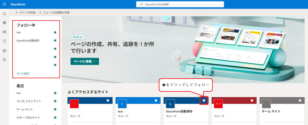 保存先として使用するSharePointサイトを、あらかじめフォローしてください。