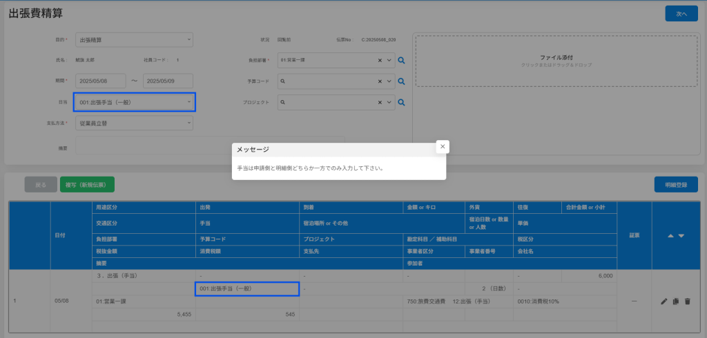 以下の両方に手当が入力されている場合、申請時にエラーメッセージが表示され、申請できなくなります。