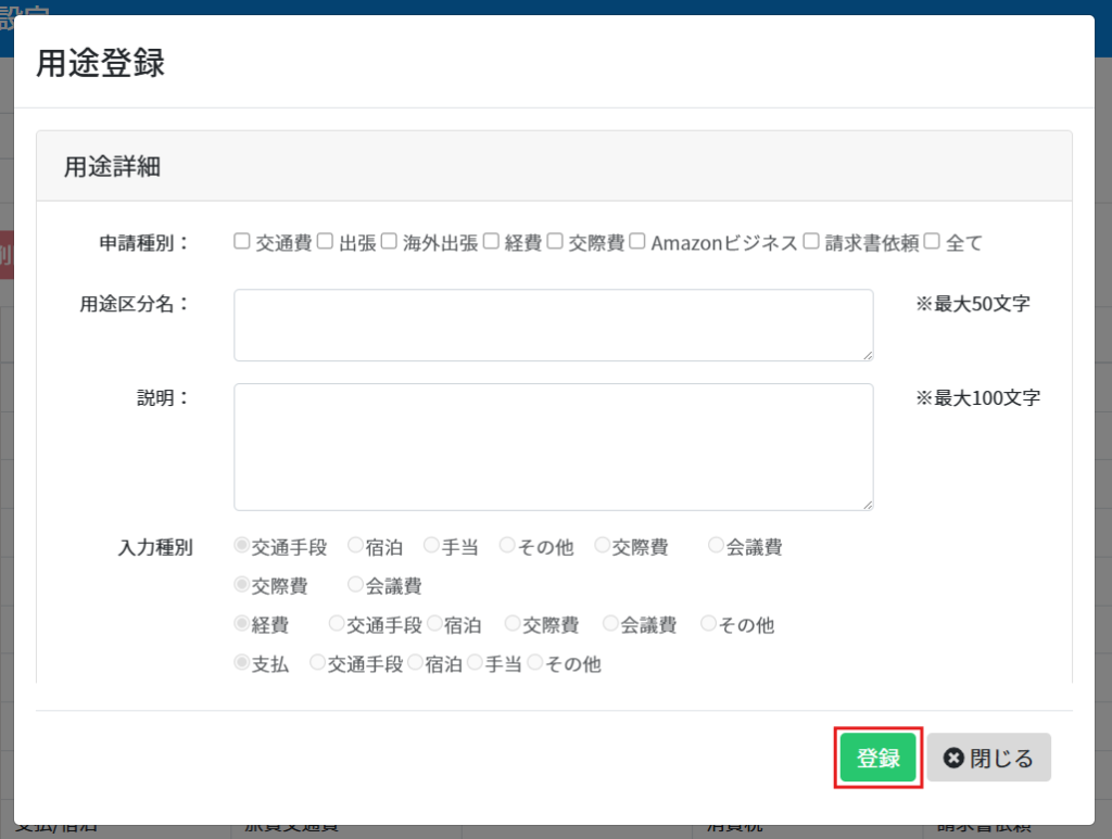 申請種別で「出張」「海外出張」「交際費」のいずれかを選択した場合、入力種別を設定します。