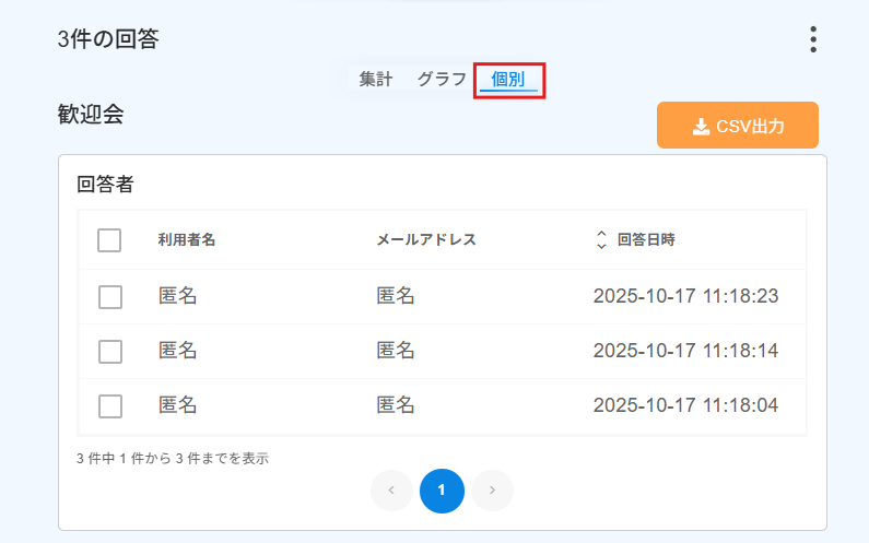 結果は自動的にリアルタイムで集計され、個別の回答内容や集計結果をグラフで確認できます。