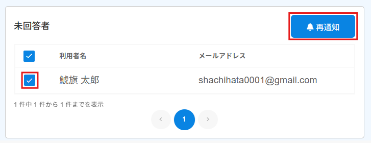 再通知を送りたい未回答者にチェックを入れ、[再通知]をクリックしてください。