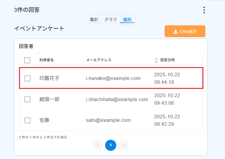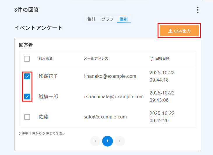 特定の回答者のみを出力する場合は、該当する回答者にチェックを入れて[CSV出力]をクリックします。