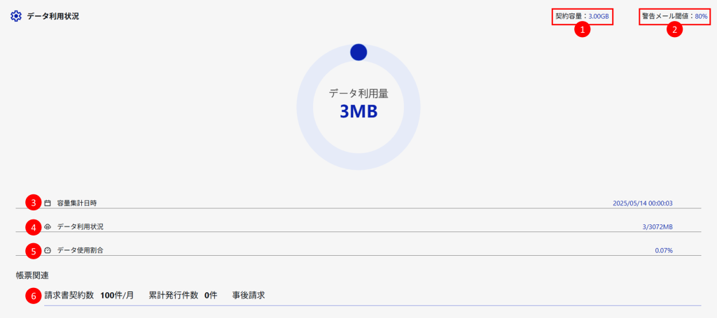| 3 | 容量集計日時 | 最新のデータ利用量が集計された日時を表示します。 |