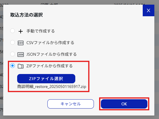 3. 「ZIPファイルから作成する」を選択し、[ZIPファイル選択]ボタンから該当ファイルをアップロードします。その後、[OK]をクリックします。