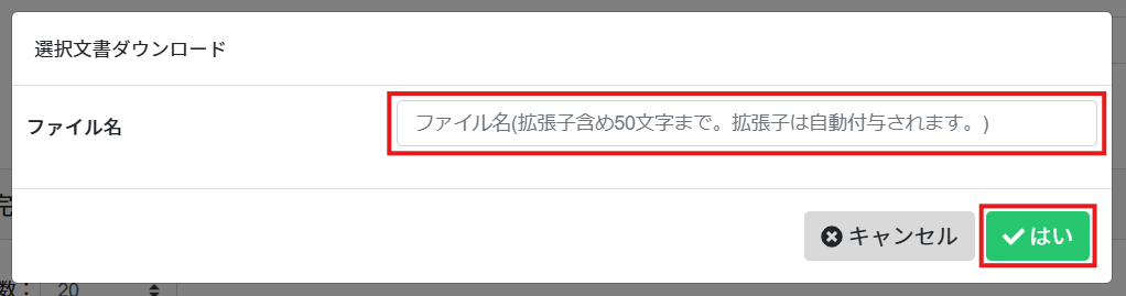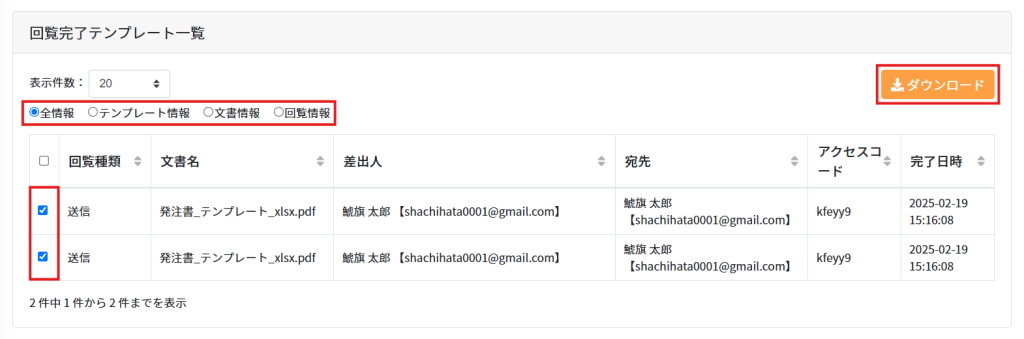 3.出力する情報を選択し、該当の文書にチェックを入れて[ダウンロード]をクリックします。