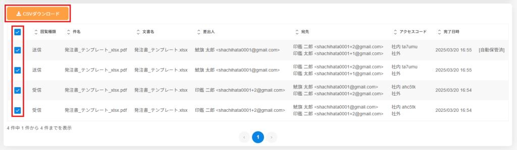 3.該当の文書にチェックを入れ、[CSVダウンロード]をクリックします。
