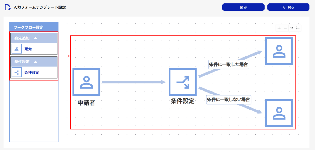 「宛先」や「条件分岐」のブロックをドラッグ&ドロップで配置し、回覧順に矢印で接続します。