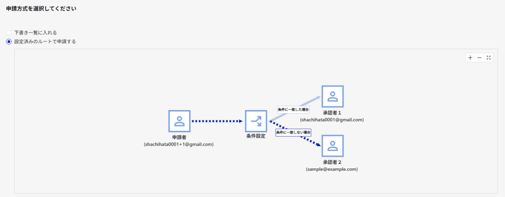 フォームから回覧申請を行う際に、申請方法選択画面で 「設定済みのルートで申請する」 を選び、設定通りのルートが表示されれば確認完了です。