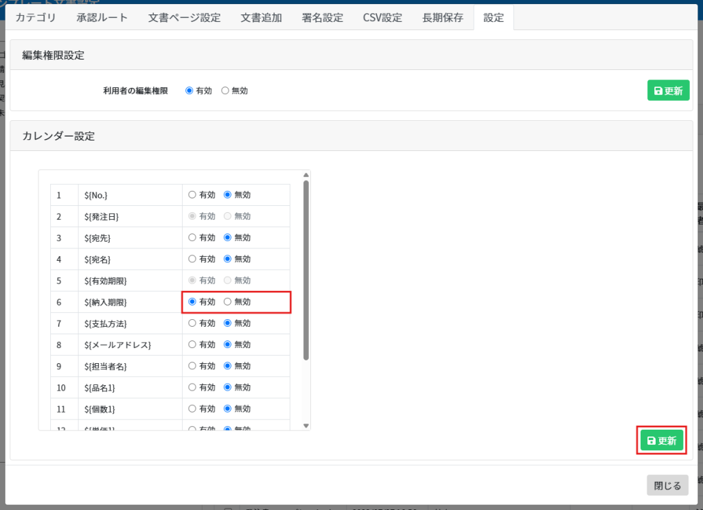 2.編集権限を「有効/無効」に設定し、[更新]をクリックします。
