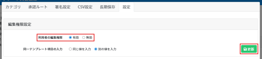 2.利用者の編集権限を「有効/無効」に設定し、[更新]をクリックします。