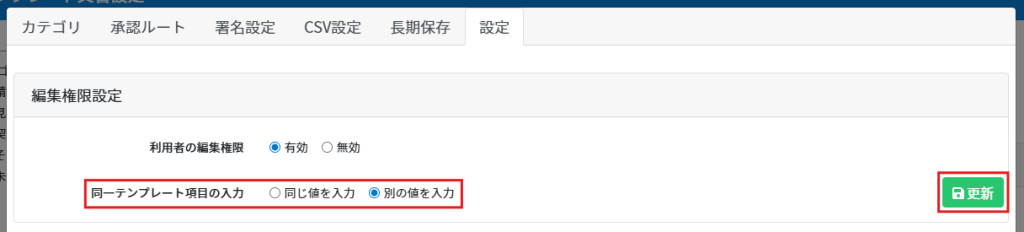 2.同一テンプレート項目の入力で「同じ値を入力/別の値を入力」を選び、[更新]をクリックします。