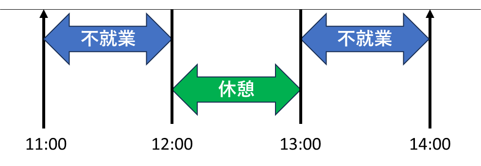 例) 休憩時間 12:00 ~ 13:00 ,不就業時間 11:00 ~ 14:00 の場合休憩時間が優先されるため、不就業の取得時間は2時間となります。