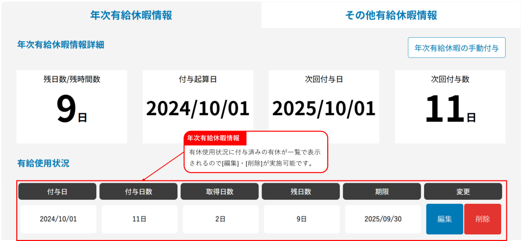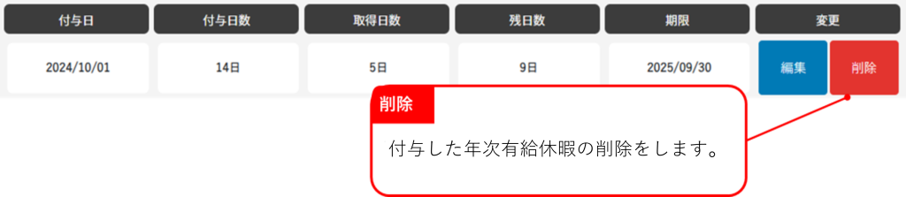 設定>休暇管理より従業員に対して付与した年次有給休暇については、編集や削除を実施することができます。