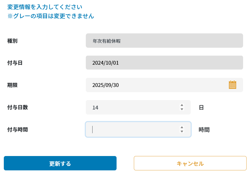 | 付与日数 | 年次有給休暇を付与した日数 ※すでに取得済みの休暇日数よりも少ない付与日数に変更することはできません。 |