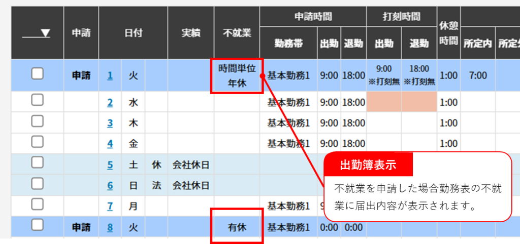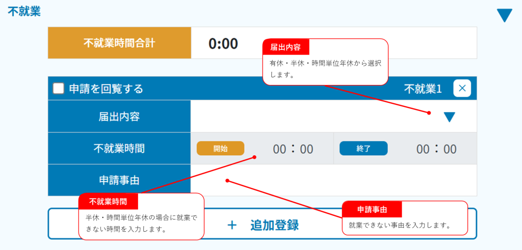 | 不就業時間 | 半休・時間単位年休の場合に就業できない時間を入力します。時間単位年休の場合は1時間単位の時間を設定します。 |